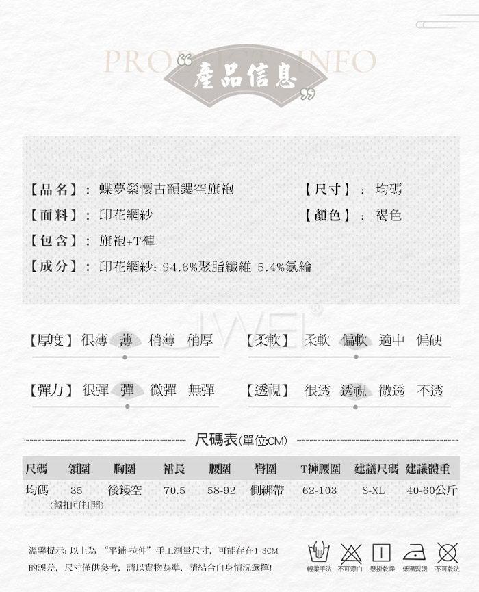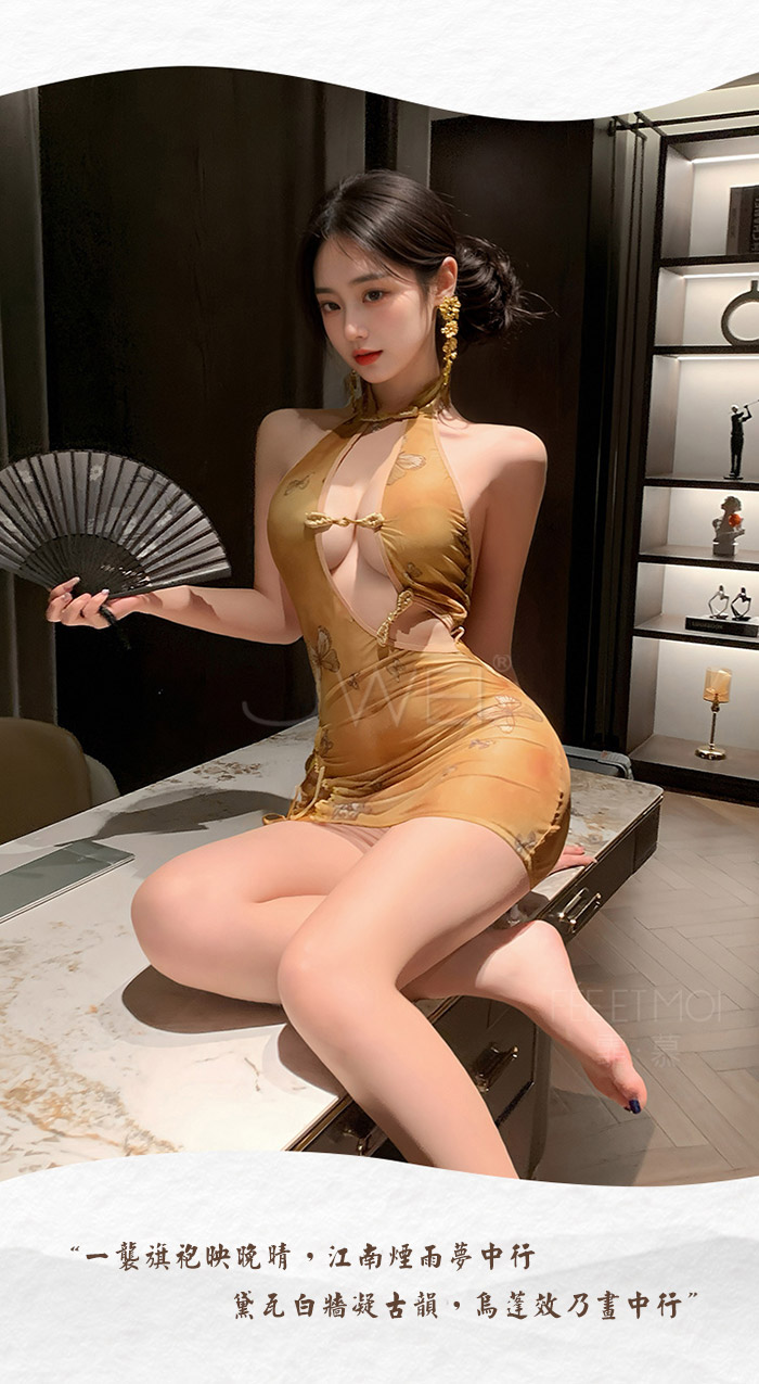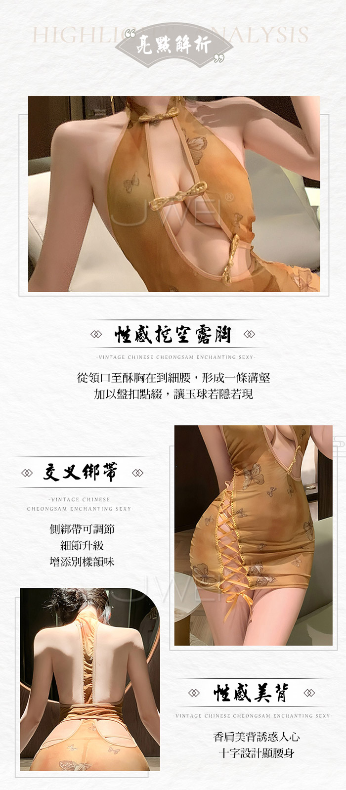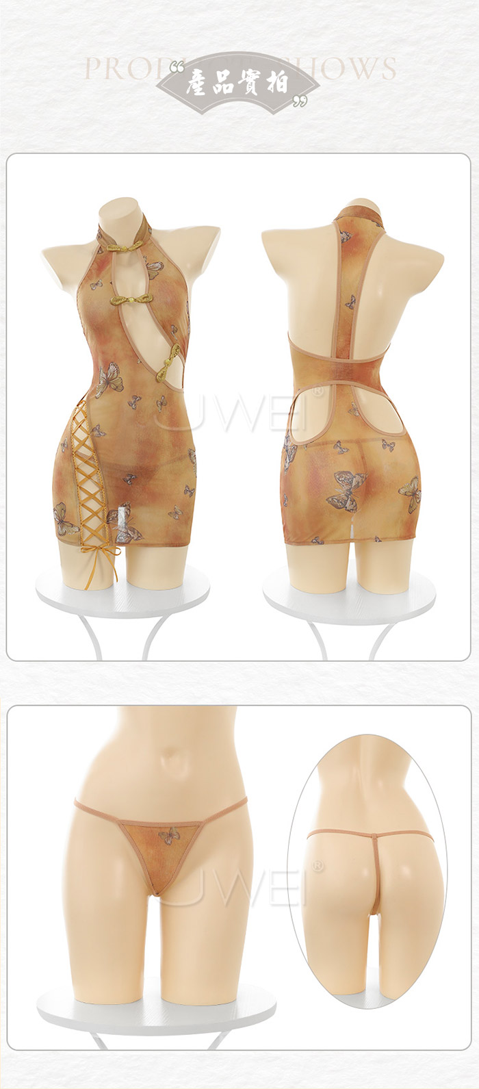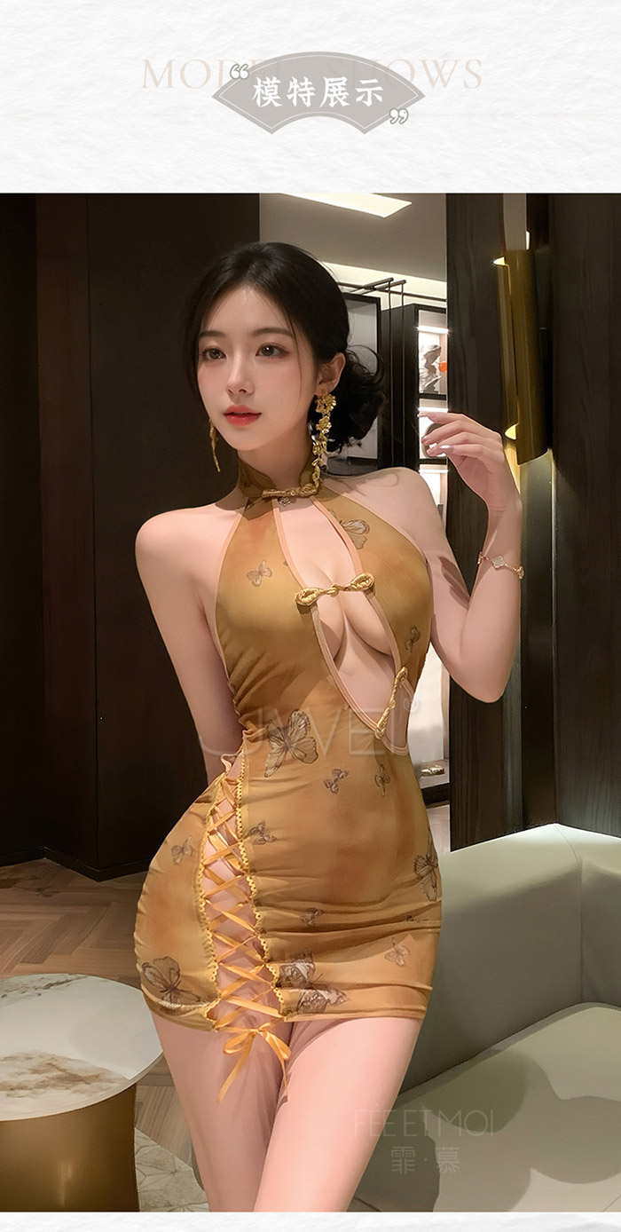 ►您現在的位置:首頁>蝶夢縈懷.性感挖空露溝開衩交叉綁帶美背古韻鏤空旗袍【旗袍+T褲】