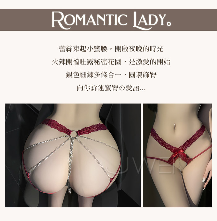 愛鏈之夜.圓環鏈條勒臀純欲蕾絲花邊開檔內褲【酒紅】