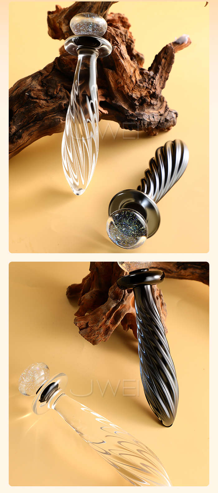 冷兵器.圓潤尖頭環形螺紋冰火雙體驗玻璃後庭肛塞【透黑】