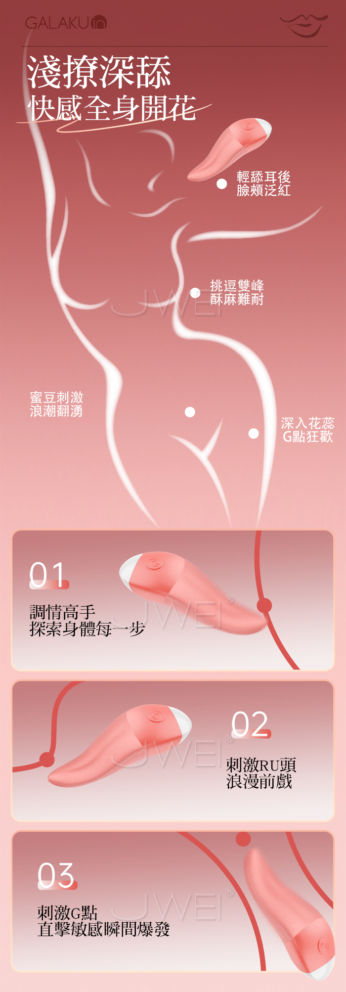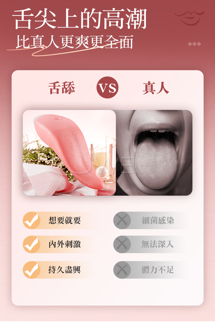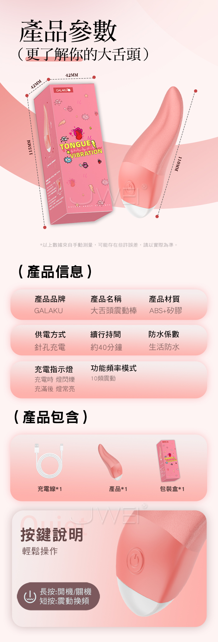 舌尖上的高潮,柔軟貼合 潮水肆意噴發!比真人更爽更全面! 舔得精准,内外兼攻,舔到潮湧舌功了得,10頻強震酥麻,刺激陰部! 產品規格 ■材質: 矽膠+ABS ■規格: 詳如圖片標示 ■功能: 10頻震動