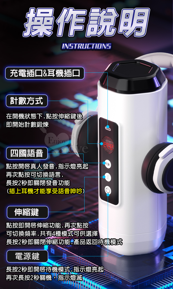 ►您現在的位置:首頁>靈犀律動杯 ‧ 智能4頻調控伸縮+語音+計數鍛煉榨精飛機杯﹝四國語音呻吟+顆粒刺激腔道+耳機+USB充電﹞