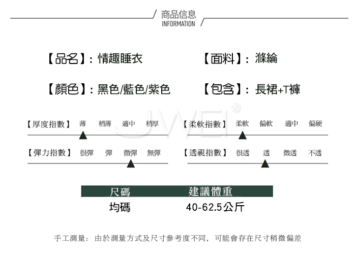 ■內容物:長裙+T褲 ■適穿尺寸:FREESIZE ■彈性:有 ■未撐開平量尺寸正負誤差1~2cm,1吋=2.54cm ■注意事項:基於保障消費者個人衛生,此貼身衣物恕不接受退換貨。 (如為商品本身暇疵,接受七日內換貨,請勿試穿,謝謝您)