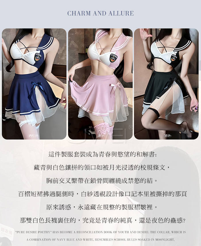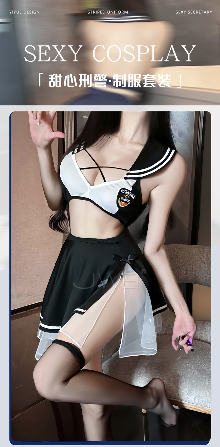 ►您現在的位置:首頁>甜心刑警.胸前交叉繫帶清純百褶透視白紗COS制服套裝【上衣+短裙-黑+白】